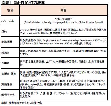 CM-FLIGHTの目的は、アッサム州の若者を、外国語能力および求められる技能を備えたグローバル人材に育成し、先進国を中心とした海外の雇用機会にチャレンジできるようにすることである。初年度の外国語訓練は日本語に限定されており、他の言語への展開は今のところ未定であることから、このスキームが、高いレベルの日本語能力習得(N2水準相当)と、特定技能制度を通じて日本での就労を目指すものであることは明らかである。就労予定先についても、日本で就業者不足が深刻な産業分野が優先されている。